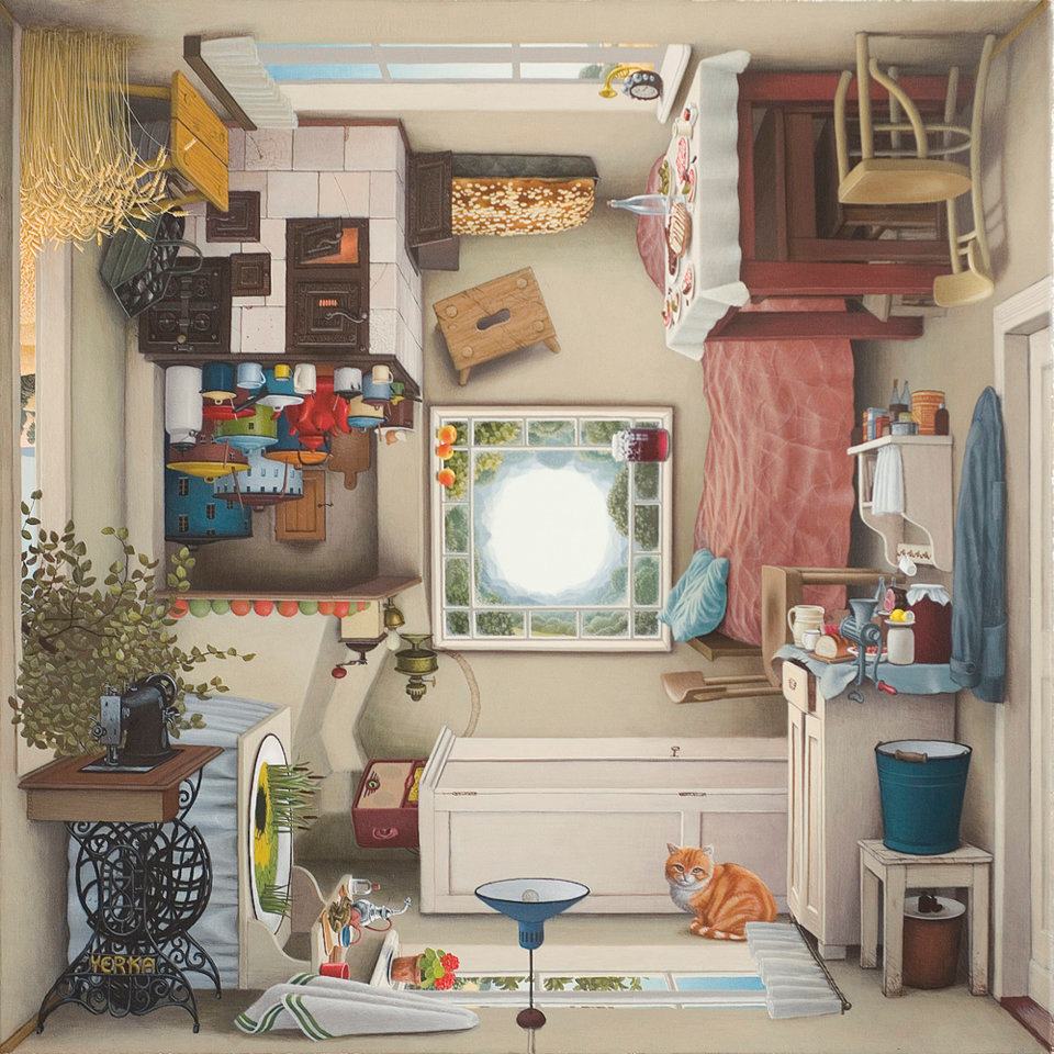 Jacek Yerka excels in painting the inverted worlds of interiors. Here two paintings show each side of the room having its own separate world, emphasising the changing viewing perspective.
