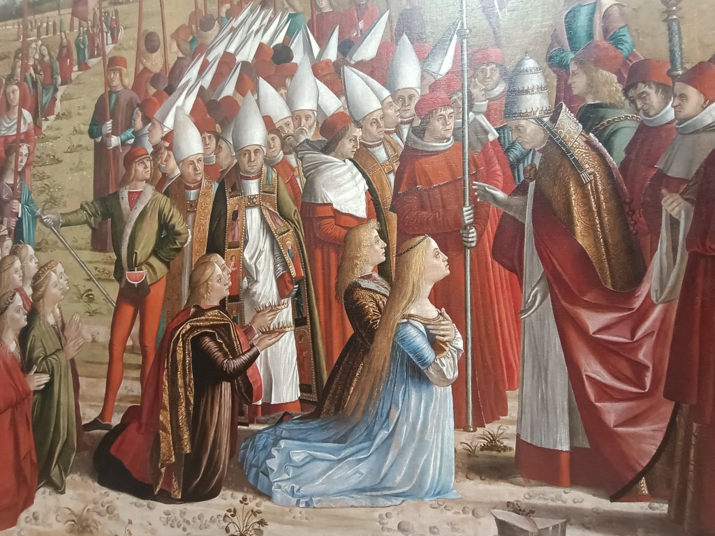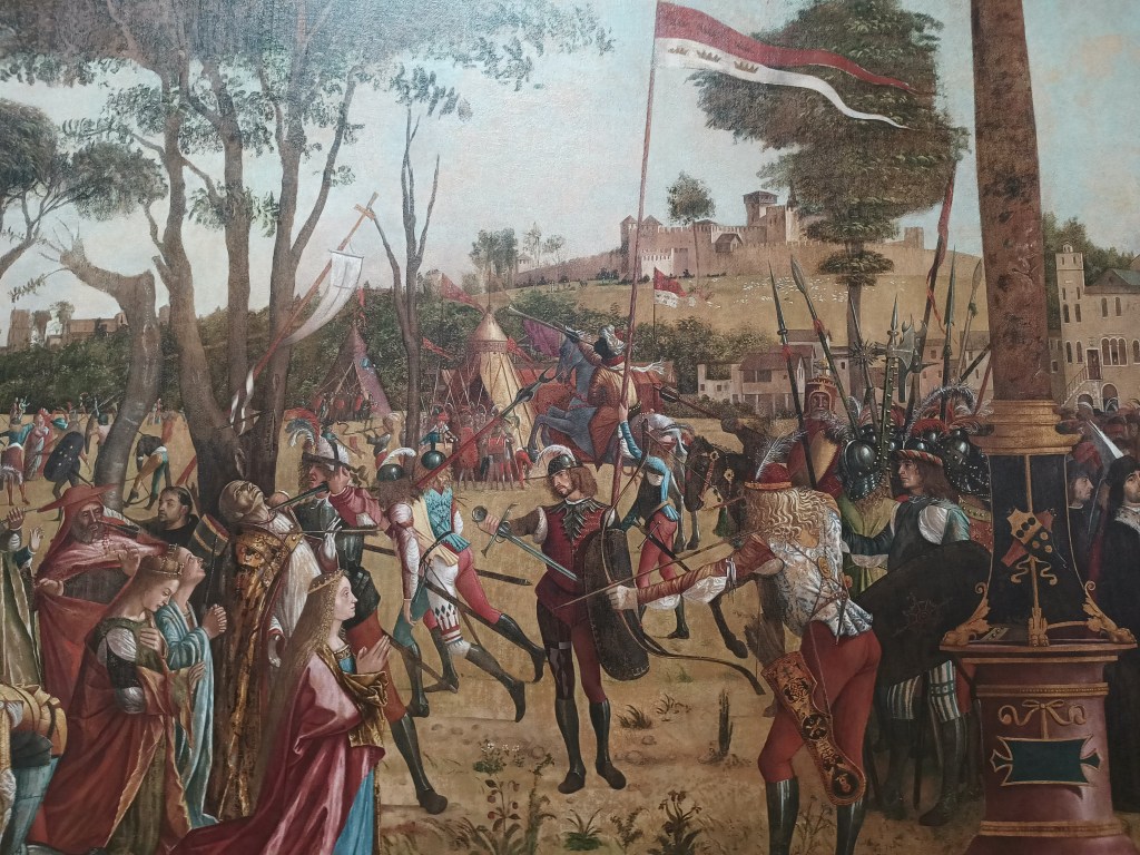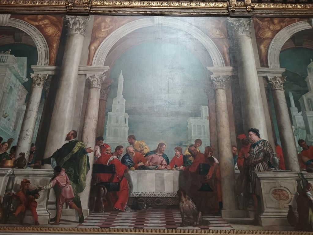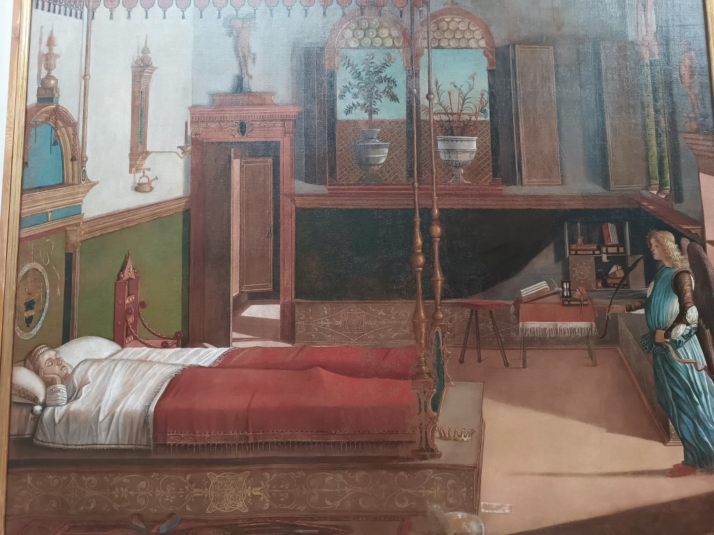 Gallerie dell’Accademia was “a must” on my Venice list. It hosts “the largest collection of Venetian art in existence”, starting from the Byzantine art in Room 1 and continuing to Early and High Renaissance, and Baroque paintings. My highlight was seeing Giorgione’s The Tempest (c. 1507), an enigmatic painting, whose ambiguousness still astounds and inspires many (Lord Byron was a fan), Lorenzo Lotto’s Portrait of a Gentleman (c. 1525), whose many symbolic details I was completely missing before, as it turned out, and Paulo Veronese’s Feast in the House of Levi (1573), which originally meant to be a painting depicting the Last Supper. Unfortunately, the painting that I really wanted to see – Healing of the Madman (c. 1496) by Vittore Carpaccio was not on display as it was being restored, but I was more than “compensated” by the series of paintings – Cycle of St. Ursula (1490-98) by Carpaccio. A whole room is devoted to this cycle, and large wall paintings transport you to the sorrowful tale of St. Ursula, who, according to a legend, was the daughter of the Christian king of Brittany, betrothed to a pagan prince who was supposed to convert to Christianity as his marriage condition. The couple made a pilgrimage to Rome, but, returning, St. Ursula was killed by Attila the Hun, and her 10.000 virgin-followers were also massacred. Arrival of the Ambassadors, depicting the meeting between the king and the ambassadors, and The Dream of St. Ursula are particularly striking, the latter depicting the saint sleeping and an angel entering her chamber, announcing the forthcoming martyrdom (see also my post Dreaming in Art: 5 Fantastical Paintings for comparative paintings).